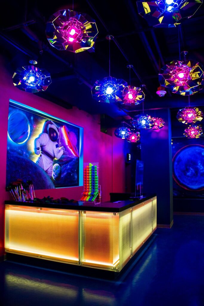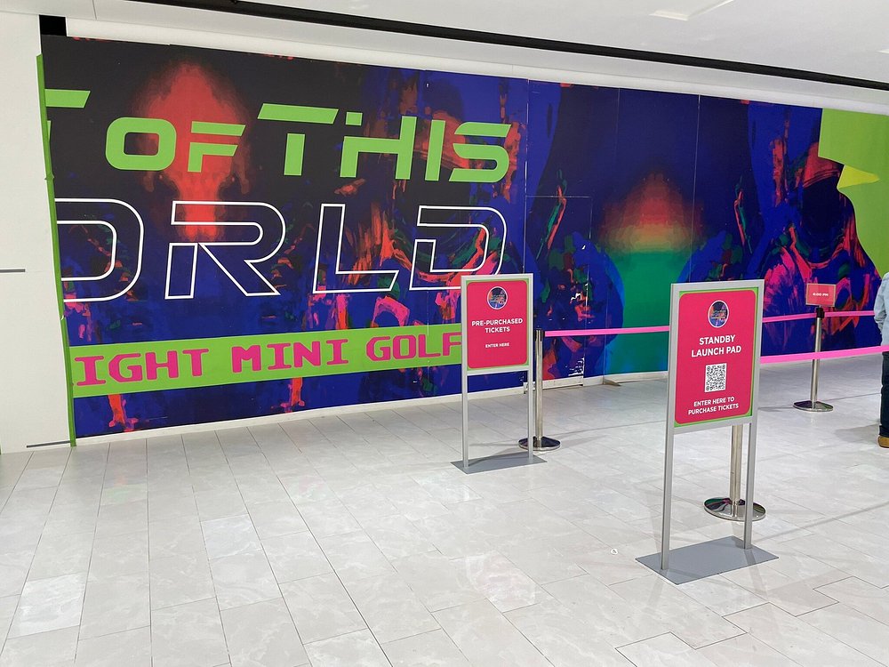 An indoor mini golf course with glowing neon lights and creative designs, providing a fun and unique golfing experience for families.