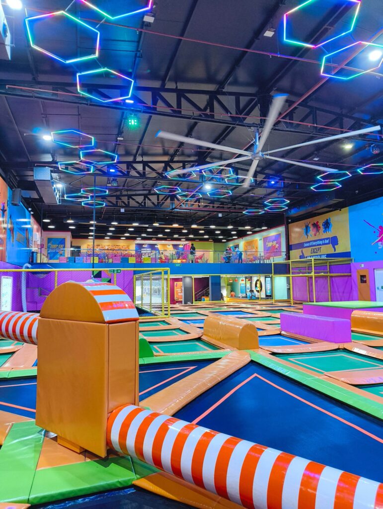 A large indoor trampoline park where families can jump, play dodgeball, and enjoy foam pits and climbing walls.