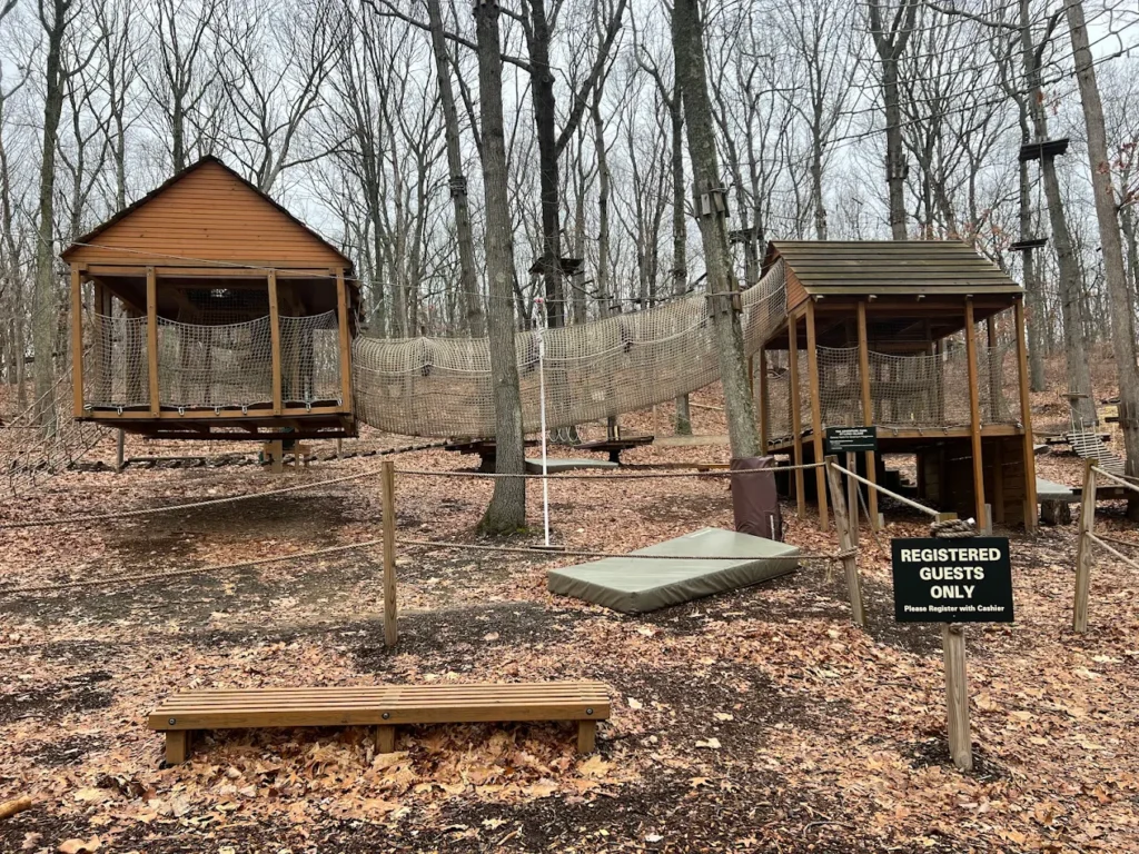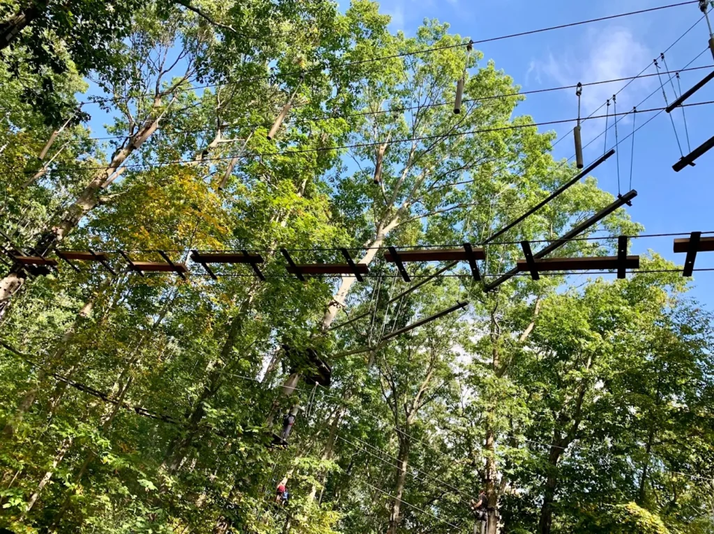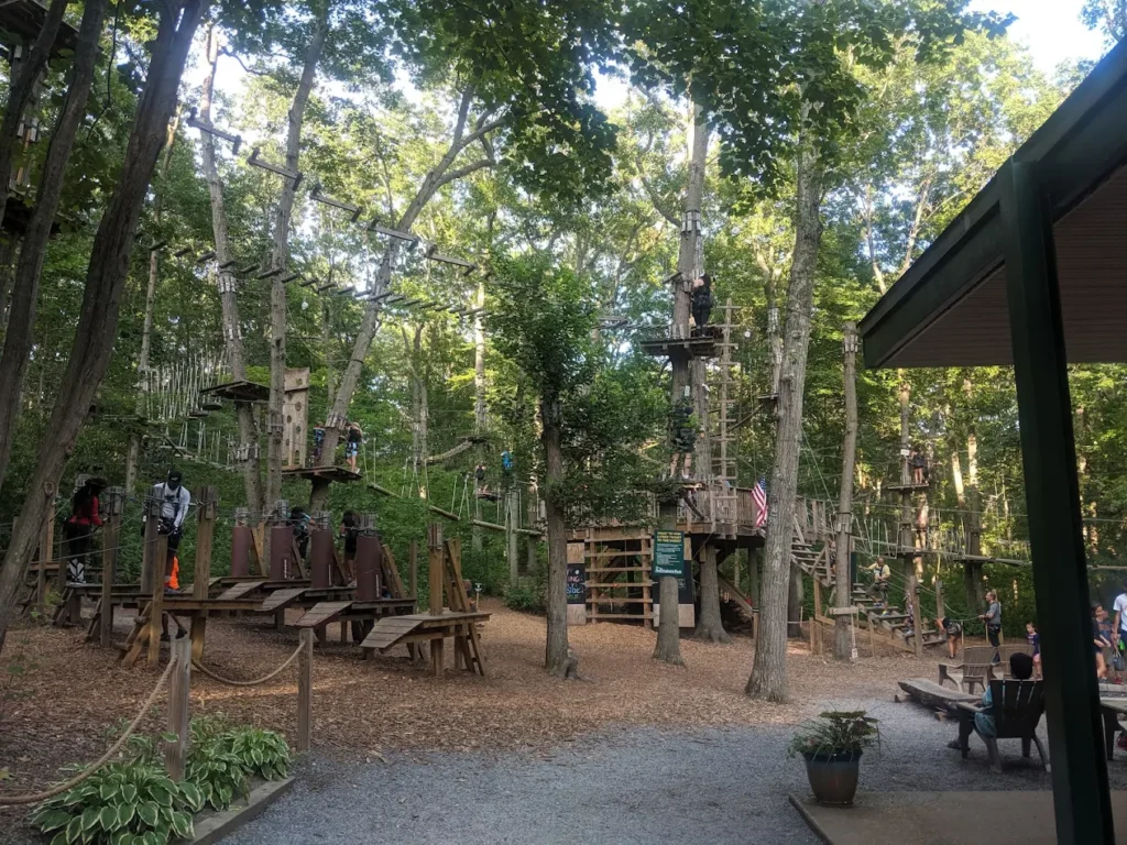 An aerial forest park with zip lines and rope courses, offering outdoor adventure for families and groups.